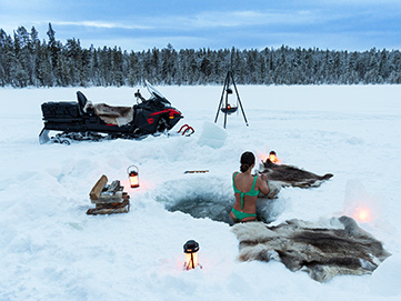 Bereite dich mit einer aktivierenden Atemtechnik und Visualisierungsmeditation auf dein Eisbade-Abenteuer vor. Spaß garantiert bei der Schneemobil-Schlittenfahrt durch die unberührte Wildnis! Am Nachmittag geht es dann ins kalte Wasser – unter Annes professioneller Anleitung erlebst du das Eisbaden in einem natürlichen, eisigen See.